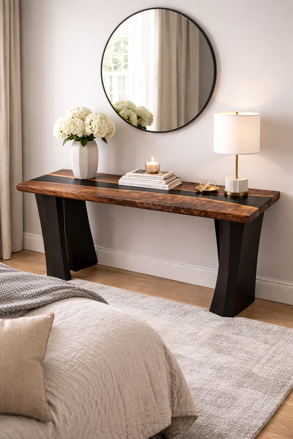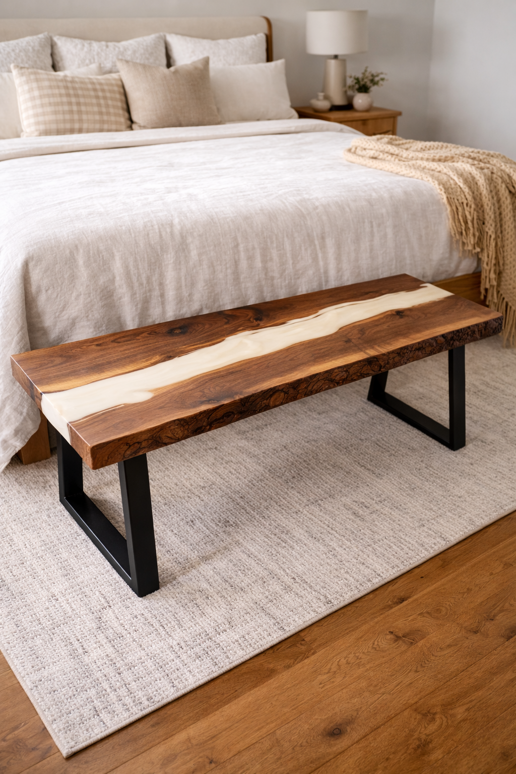 Versatile and handcrafted, our custom epoxy benches are designed for both style and function. Whether placed at a dining table, in an entryway, or at the foot of a bed, each bench is customized to your preferred wood, epoxy details, and size.